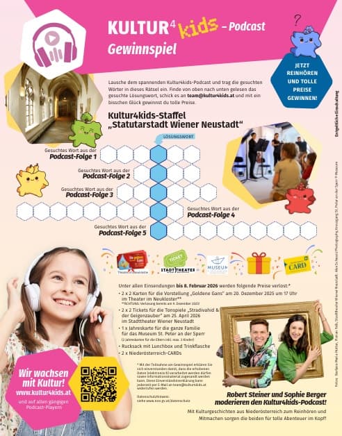 Lausche dem spannenden Kultur4kids-Podcast und trag die gesuchten Wörter in dieses Rätsel ein. Finde von oben nach unten gelesen das gesuchte Lösungswort, schick es an team@kultur4kids.at und mit ein bisschen Glück gewinnst du tolle Preise.